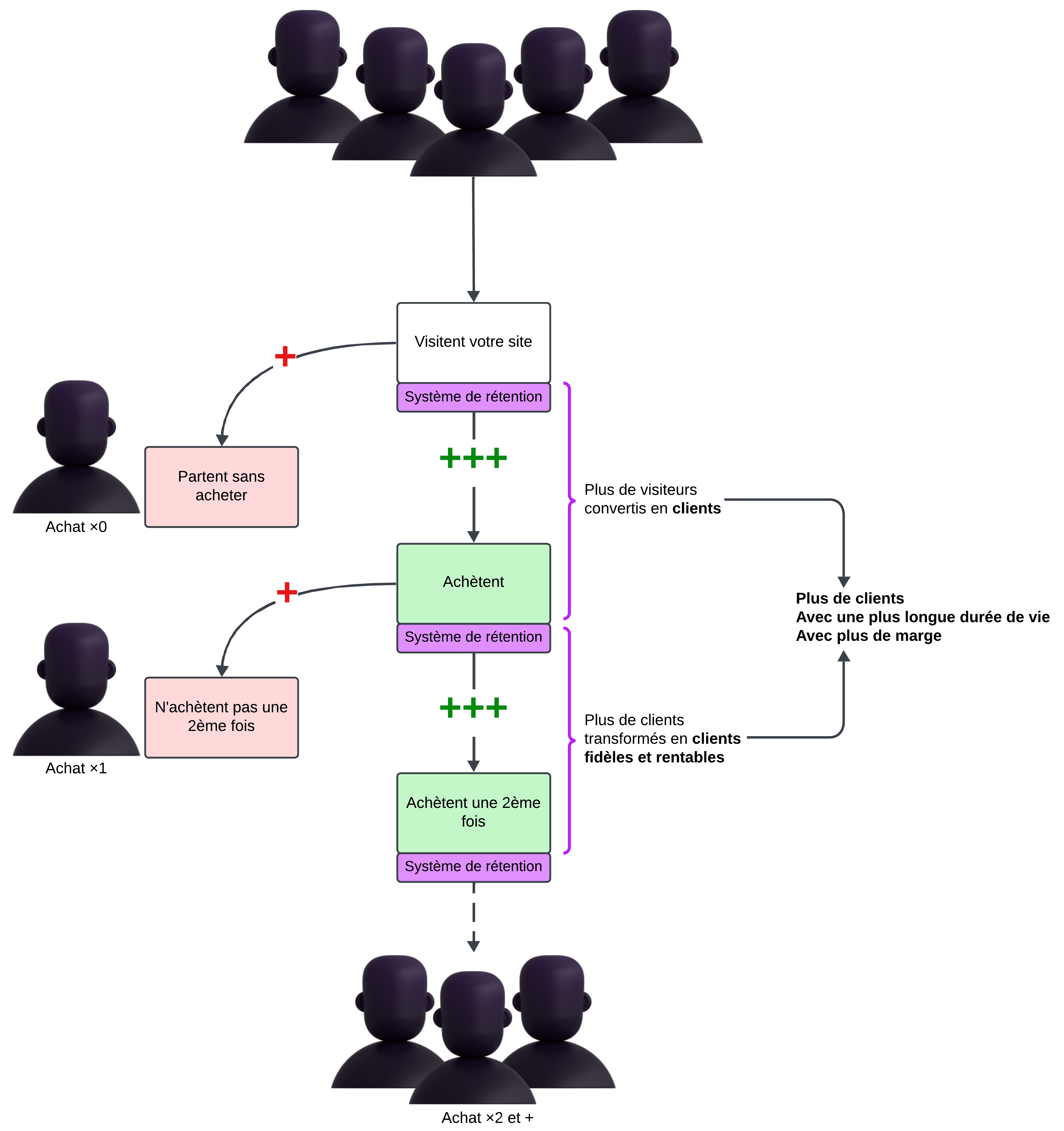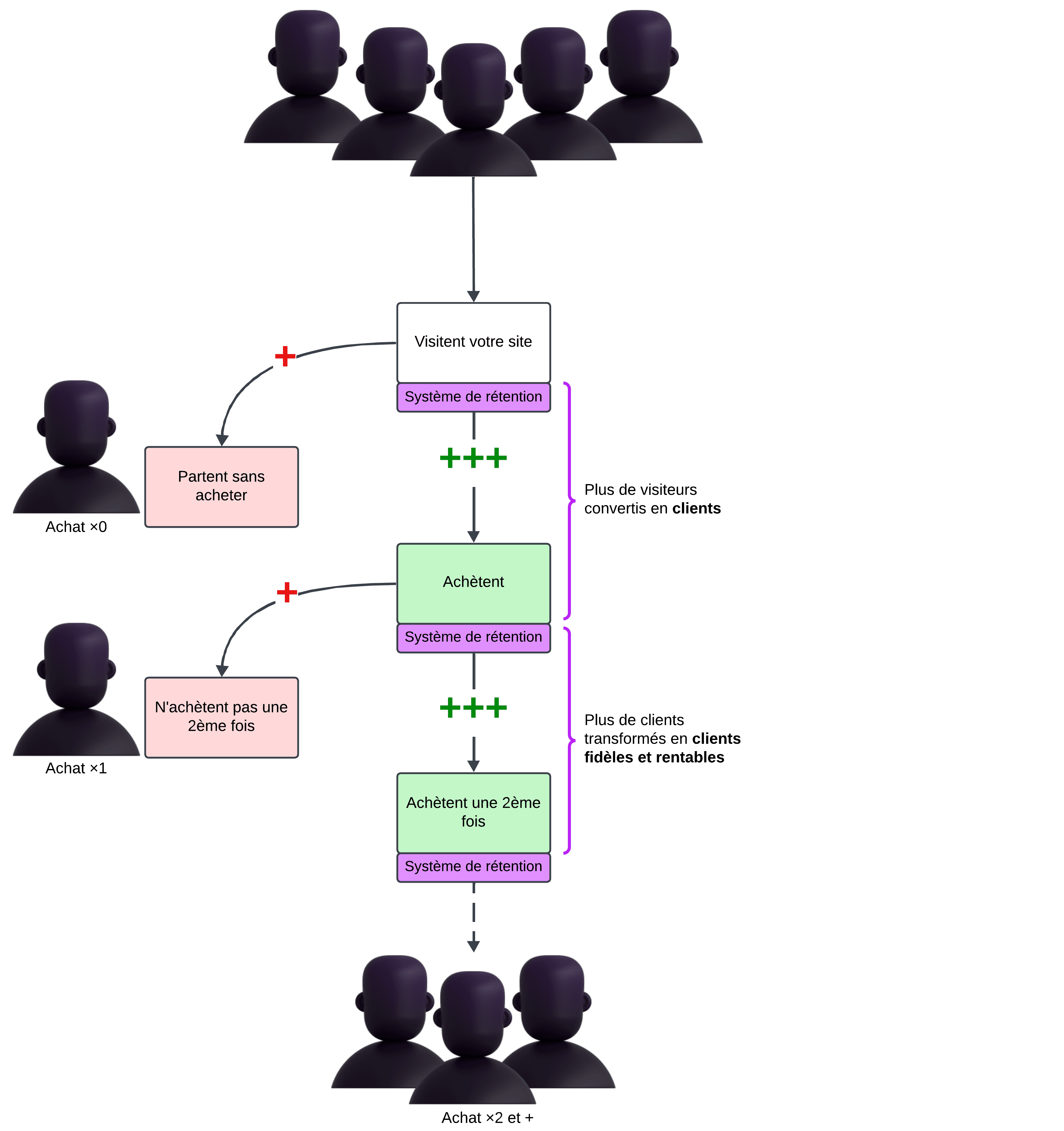 Nous vous mettons en place un système qui permet de convertir plus de visiteurs en clients, tout en fidélisant vos clients pour qu'ils restent chez vous plus longtemps et dépensent plus au cours de leur vie client.